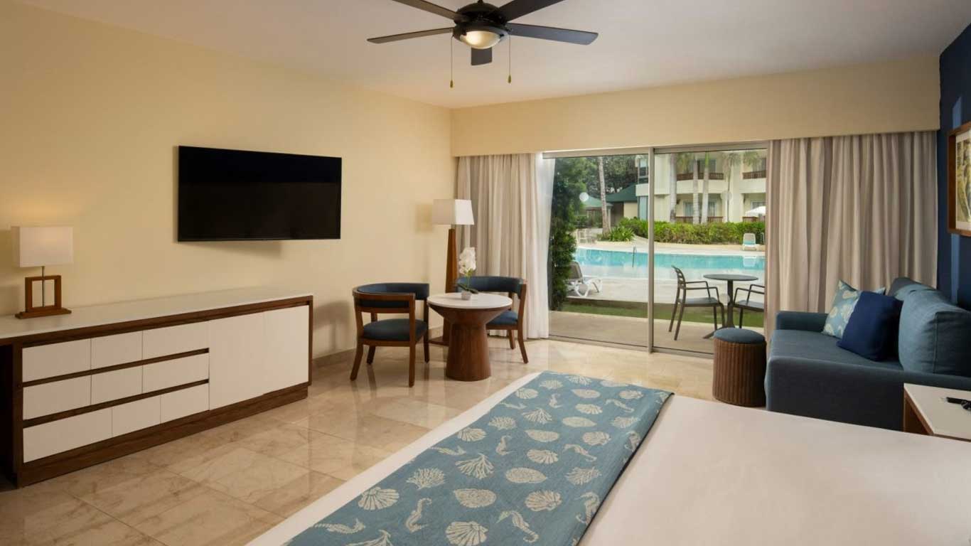 The Pool View Junior Suite at Impressive Premium Resorts & Spas is just a few steps from the pool areas. Guests can relax and enjoy delicious cocktails at the swim-up bars. Soak up some Punta Cana sun by the pool while spending a fun, relaxing time with family and friends. Maximum occupancy 3 adults and 1 child.