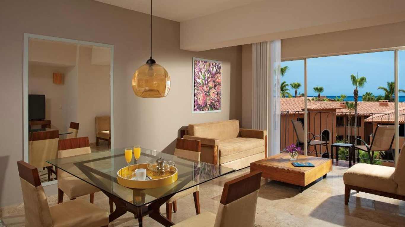 Experience luxury and upscale amenities in the One Bedroom Suite at Krystal Grand Los Cabos Hotel features a king-sized bed, satellite TV, full marble bathroom, and a separate living room with a sofa bed. You will also be able to enjoy the view overlooking the pivate residential street.